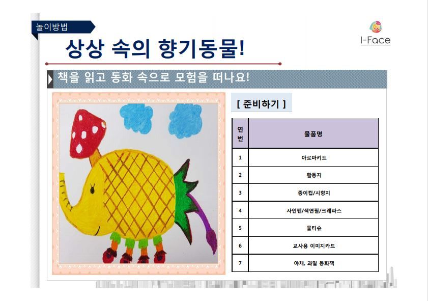 상상동물 그리기 | ▪편식개선을 위한 야채, 과일 향 탐색 ▪연상되는 향과 느낌에 대해 이야기 나누기 ▪상상력을 이끌어내는 오감탐색 질문하기 | |