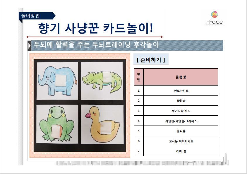 1 | 향기사냥꾼 놀이 | ▪같은 향, 다른 향 찾기 ▪향을 맡고 떠오르는 경험에 대해 이야기 나누기 ▪오감탐색 질문을 통해 창의력 향상 |