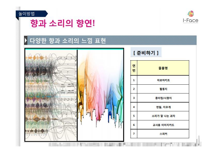 후각▪청각 스토리 텔링 | ▪소리와 어울리는 향 매칭하기 ▪눈에 보이지 않는 소리 이미지 상상 ▪향과 소리의 조화 | |